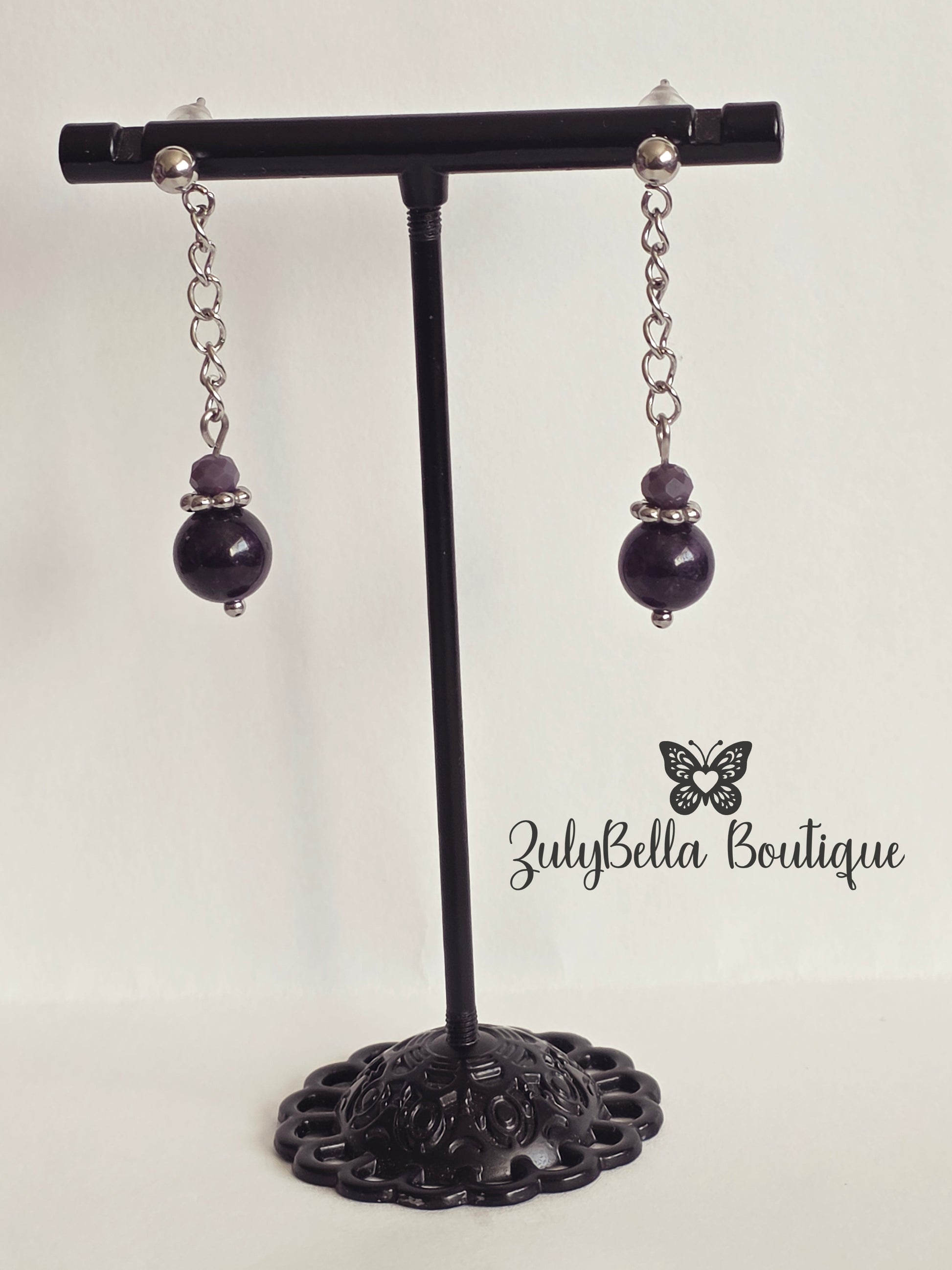 Made with purple stone and Glass bead. Stainless Steel Post and chain.